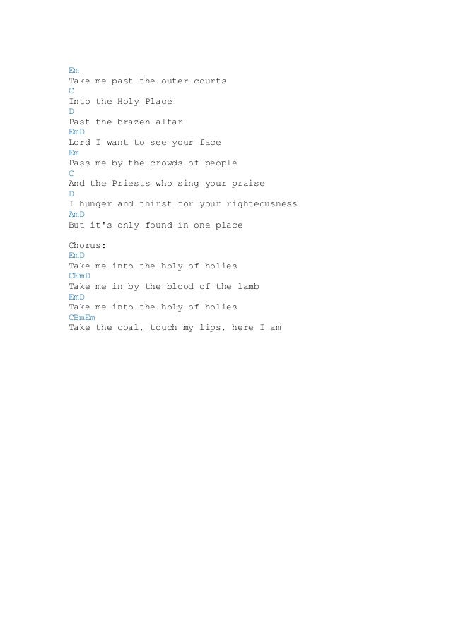 Take me into the holy of holies chords. Dave BrowningCover By. Em Pass me by the crowds of people C The priests who sing their praise D I hunger and thirst for your righteou. Catherine MullinsLyrics Take me past the outer courtsInto the holy placePast t.